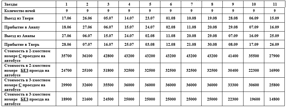 Возможно приобретение только проезда по маршруту Тверь–Анапа–Тверь – 16000 руб./чел. (туда и обратно) -июнь, сентябрь; 17000 (туда и обратно) -июль, август.