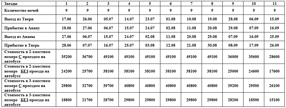 Возможно приобретение только проезда по маршруту Тверь–Анапа–Тверь – 16000 руб./чел. (туда и обратно) -июнь, сентябрь; 17000 (туда и обратно) -июль, август.