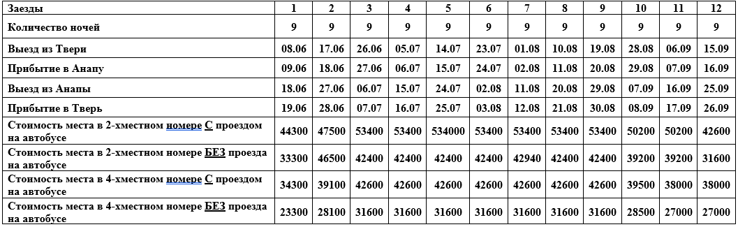 В стоимость входит: проживание, проезд на автобусе (если тур покупается с проездом), страхование пассажиров. Возможно приобретение только проезда по маршруту Тверь–Анапа–Тверь – 16000 руб./чел. (туда и обратно) -июнь, сентябрь; 17000 (туда и обратно) -июль, август.