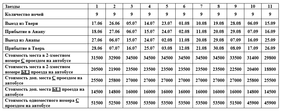 Дополнительное место до 12 лет/после 12 лет (в таблице). В стоимость входит: проживание, проезд на автобусе (если тур покупается с проездом), страхование пассажиров. Возможно приобретение только проезда по маршруту Тверь–Анапа–Тверь – 16000 руб./чел. (туда и обратно) -июнь, сентябрь; 17000 (туда и обратно) -июль, август.